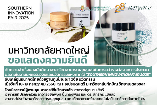 มหาวิทยาลัยหาดใหญ่ ขอแสดงความยินดี กับความสำเร็จของนักศึกษาสาขาวิชาสาธารณสุขชุมชน ในการคว้ารางวัลจากการประกวดผลงานในงานมหกรรมวิจัยและนวัตกรรมแห่งภาคใต้ “Southern Innovation Fair 2025” ขับเคลื่อนอนาคตไทยด้วยฐานภูมิปัญญา วิจัย นวัตกรรม เมื่อวันที่ 18-19 กรกฎาคม 2568 ณ หอเปรมดนตรี มหาวิทยาลัยทักษิณ วิทยาเขตสงขลา