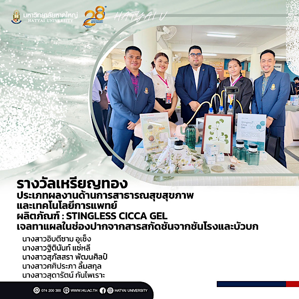 โดยคว้ารางวัลเหรียญทอง ประเภทผลงานด้านการสาธารณสุขสุขภาพ และเทคโนโลยีการแพทย์ ผลิตภัณฑ์ : Stingless Cicca Gel เจลทาแผลในช่องปากจากสารสกัดชันจากชันโรงและบัวบก รายชื่อนักศึกษา: 1. นางสาวอิบตีซาม อูเซ็ง 2. นางสาวฐิตินันท์ แซ่หลี 3. นางสาวสุภัสสรา พัฒนศิลป์ 4. นางสาวศศิประภา ลิ้มสกุล 5. นางสาวสุดารัตน์ กันไพเราะ