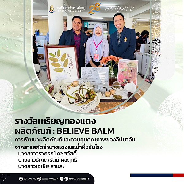 และคว้ารางวัลเหรียญทองแดง ผลิตภัณฑ์ : Believe Balm การพัฒนาผลิตภัณฑ์และควบคุมคุณภาพของลิปบาล์ม จากสารสกัดย่านางแดงและน้ำผึ้งชันโรง รายชื่อนักศึกษา: 1. นางสาววราภรณ์ คชสวัสดิ์ 2. นางสาวธัญญรัตน์ คงฤทธิ์ 3. นางสาวเอเซีย สาและ