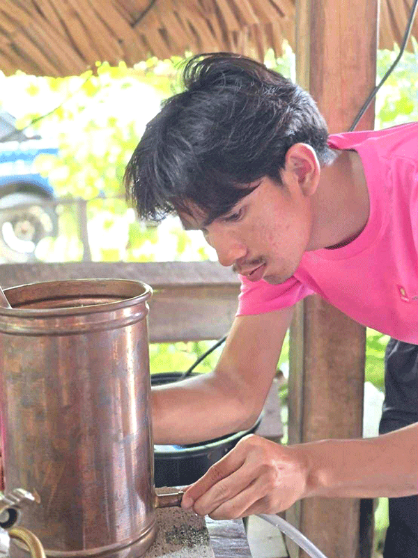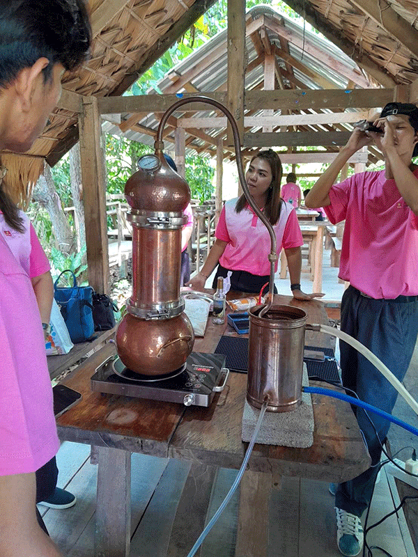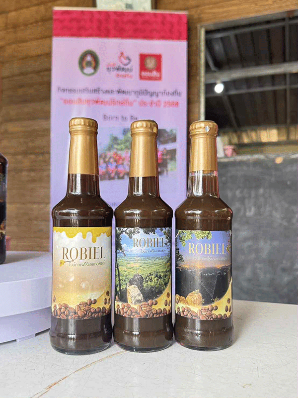 ในส่วนของกระบวนการพัฒนาไวน์กาแฟไร้แอลกอฮอล์ เริ่มจากการเพิ่มมูลค่ากาแฟตกเกรด โดยนำกาแฟตกเกรดมาผ่านกระบวนการหมักพิเศษ ใช้เทคนิคการหมักแบบคอนโทรลที่อุณหภูมิและความชื้นที่เหมาะสม ระยะเวลาการหมักที่ช่วยเพิ่มกลิ่นรสและคุณค่าทางโภชนาการ ใช้กระบวนการกลั่นแบบช้าเพื่อกลั่นให้ได้ไวน์กาแฟไร้แอลกอฮอล์ จากนั้นนำมาผสมผสานกับน้ำผึ้งท้องถิ่น โดยใช้น้ำผึ้งชันโรงและน้ำผึ้งโพรงจากเกษตรกรในชุมชน ศึกษาอัตราส่วนที่เหมาะสมเพื่อให้ได้รสชาติที่กลมกล่อม รักษาคุณค่าทางโภชนาการและสารต้านอนุมูลอิสระจากน้ำผึ้งธรรมชาติ