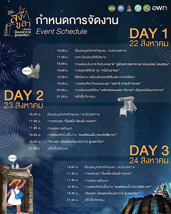 ทั้งนี้ งาน “สงขลา เมืองแห่งป้อมปราการสู่มรดกโลก” จัดขึ้นระหว่างวันที่ 22–24 สิงหาคม 2568 เวลา 16.00–22.00 น. ณ บริเวณเมืองเก่าหัวเขาแดง อำเภอสิงหนคร จังหวัดสงขลา โดยจังหวัดสงขลามุ่งมั่นที่จะใช้โอกาสนี้เป็นก้าวสำคัญในการสืบสานคุณค่ามรดกวัฒนธรรมและผลักดันสู่การขึ้นทะเบียนมรดกโลกต่อไป.