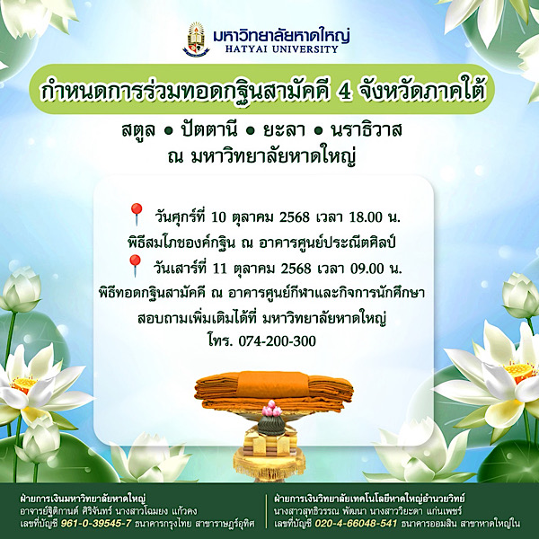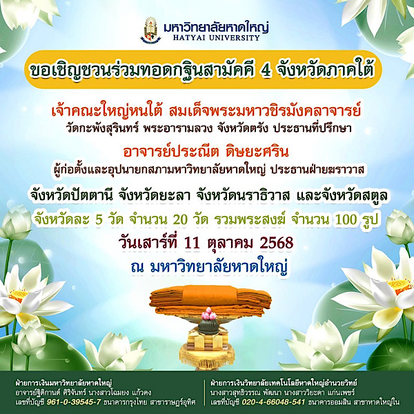 ขอเชิญร่วมงานทอดกฐินสามัคคี 4 จังหวัดชายแดนใต้ สตูล • ปัตตานี • ยะลา • นราธิวาส ณ มหาวิทยาลัยหาดใหญ่