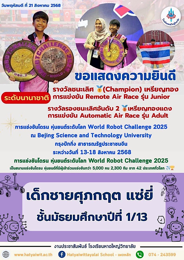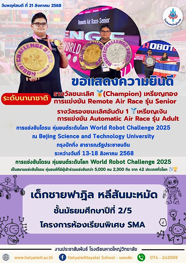 ขอแสดงความยินดีกับนักเรียนจาก DroneBot Academy : สถาบันโดรนบอท ได้รับรางวัลจากการแข่งขันโดรน หุ่นยนต์ระดับโลก World Robot Challenge 2025 ณ Bejing Science and Technology University กรุงปักกิ่ง สาธารณรัฐประชาชนจีน ระหว่างวันที่ 13-18 สิงหาคม 2568 ประเภทรายการแข่งขัน Remote Air Race รุ่น Junior รางวัลชนะเลิศ น้องยีนส์ (Champion) : เด็กชายศุภกฤต แซ่ยี่ (โรงเรียนหาดใหญ่วิทยาลัย) , รางวัลรองชนะเลิศอันดับที่ 1 น้องเจียอี้ : เด็กชายวชิรวิชญ์ ปัญญานุชิต (โรงเรียนพลวิทยาสองภาษา) , รางวัลรองชนะเลิศอันดับที่ 2 น้องฟาติน : เด็กชายกฤษ เหลาะเหม (โรงเรียนศรีสว่างวงศ์) ประเภทรายการแข่งขัน Remote Air Race (Senior) รางวัลชนะเลิศ น้องฟาฎิล (Champion) : เด็กชายฟาฎิล หลีสันมะหมัด (โรงเรียนหาดใหญ่วิทยาลัย) ประเภทรายการแข่งขัน Remote Air Race (Adult) รางวัลชนะเลิศ น้องฟู (Champion) : เด็กชายปาณชัย หนูจันทร์ (โรงเรียนศรีสว่างวงศ์) , รางวัลรองชนะเลิศอันดับที่ 1 น้องเจ้าสัว : เด็กชายวชิรวิทย์ อุย (โรงเรียนศรีสว่างวงศ์) ประเภทรายการแข่งขัน Automatic Air Race (Adult) รางวัลรองชนะเลิศอันดับที่ 1 น้องฟาฎิล : เด็กชายฟาฎิล หลีสันมะหมัด (โรงเรียนหาดใหญ่วิทยาลัย) , รางวัลรองชนะเลิศอันดับที่ 2 น้องยีนส์ : เด็กชายศุภกฤต แซ่ยี่ (โรงเรียนหาดใหญ่วิทยาลัย) สำหรับการแข่งขันโดรน หุ่นยนต์ระดับโลก World Robot Challenge 2025 ณ Bejing Science and Technology University กรุงปักกิ่ง สาธารณรัฐประชาชนจีน ระหว่างวันที่ 13-18 สิงหาคม 2568 เป็นสนามแข่งขันโดรน หุ่นยนต์ที่มีผู้เข้าร่วมแข่งขันกว่า 5,000 คน 2,300 ทีม จาก 42 ประเทศทั่วโลก.