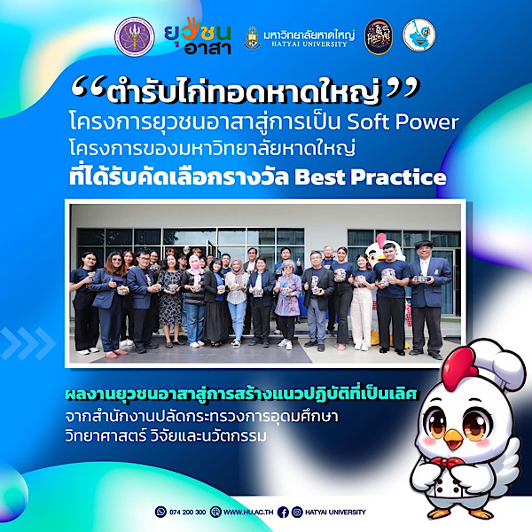 ขอแสดงความยินดีกับมหาวิทยาลัยหาดใหญ่ ที่คว้ารางวัลจากโครงการยุวชนอาสา จากการประกวดผลงาน “ยุวชนอาสาสู่การสร้างแนวปฏิบัติที่เป็นเลิศ (Best Practice)” จากสำนักงานปลัดกระทรวงการอุดมศึกษา วิทยาศาสตร์ วิจัยและนวัตกรรม ในผลงานสุดสร้างสรรค์ “ตำรับไก่ทอดหาดใหญ่”