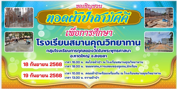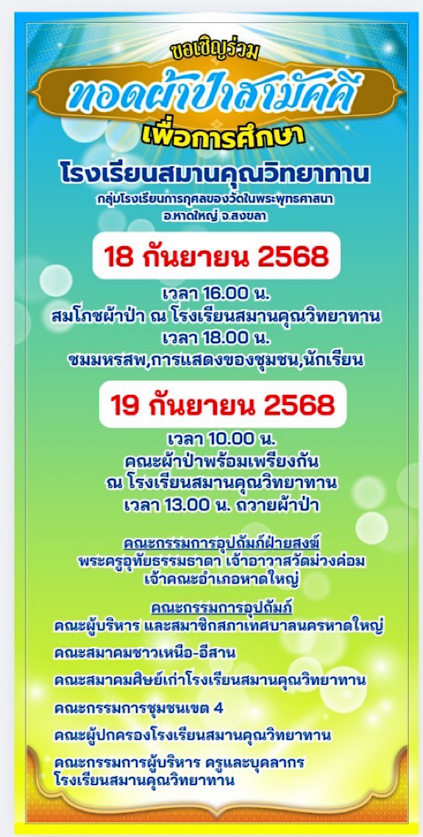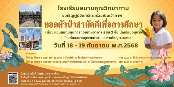 โรงเรียนสมานคุณวิทยาทานขอเชิญผู้มีจิตศรัทธาร่วมเป็นเจ้าภาพทอดผ้าป่าสามัคคีเพื่อการศึกษา เพื่อนำเงินสมทบทุนการก่อสร้างอาคารเรียน 2 ชั้น นักเรียนอนุบาล ณ โรงเรียนสมานคุณวิทยาทาน อ.หาดใหญ่ จ.สงขลา วันที่ 18 – 19 กันยายน พ.ศ.2568.