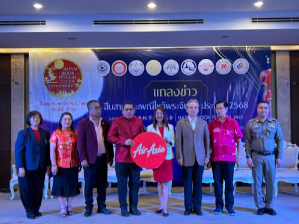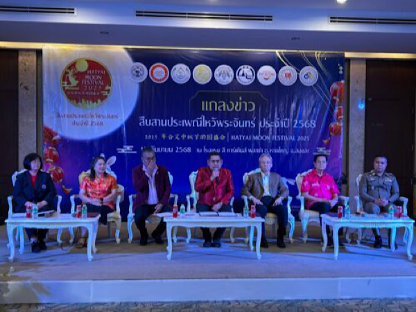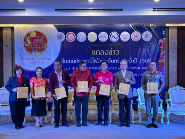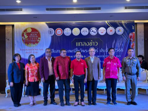 วันนี้ (19 กันยายน 2568) ที่ โรงแรมลีการ์เด้น พลาซ่า อำเภอหาดใหญ่ จังหวัดสงขลา สมาคม ไทย-จีน จังหวัดสงขลา ได้ร่วมกับหน่วยงานภาครัฐและเอกชน จัดงาน “สืบสานประเพณีไหว้พระจันทร์ ประจำปี 2568” ขึ้น เพื่อสืบสานวัฒนธรรมประเพณีอันดีงามที่มีการสืบทอดกันมารวมทั้งช่วยกระตุ้นเศรษฐกิจ สร้างภาพลักษณ์ความเชื่อมั่น ส่งเสริมรายได้ให้กับประชาชนให้มีคุณภาพชีวิตที่ดีขึ้น พัฒนาเศรษฐกิจอย่างยั่งยืน และส่งเสริมการท่องเที่ยวของอำเภอหาดใหญ่ จังหวัดสงขลา โดยมี นายสังคม เกิดก่อ รองผู้ว่าราชการจังหวัดสงขลา เป็นประธานกล่าวเปิดการแถลงข่าวและกล่าวภาพรวมของงาน พร้อมด้วยผู้ร่วมแถลงข่าวสำคัญ อาทิ นายอวง จื้อ เจียน กงสุลใหญ่สาธารณรัฐประชาชนจีนประจำจังหวัดสงขลา, นายจรัญ ชุมพาน ผู้เชี่ยวชาญพิเศษด้านการพัฒนา สังคมองค์การบริหารส่วนจังหวัดสงขลา, น.ส.นิลุบล เจริญพานิช รองนายกเทศมนตรีเทศบาลนครหาดใหญ่, นางสาวภัทรา ลิ่มนิรันดร รองผู้อำนวยการการท่องเที่ยวแห่งประเทศไทย สำนักงานหาดใหญ่, พ.ต.ท.โชคทวี จันทร์ทองอ่อน รองผู้กำกับการสอบสวน สถานีตำรวจภูธรหาดใหญ่, และ นายพิชัย วัฒนะพยุงกุล นายกสมาคมไทย-จีน จังหวัดสงขลา/ประธานจัดงาน