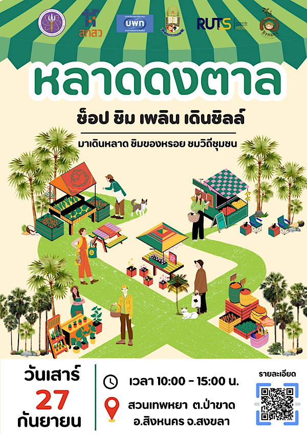 ประชาคมวัฒนธรรมสิงหนคร ขอเชิญพ่อแม่พี่น้องทุกท่าน มาสัมผัสบรรยากาศตลาดวัฒนธรรม “หลาดดงตาล” ณ สวนเทพหยา ตำบลป่าขาด อำเภอสิงหนคร จังหวัดสงขลา