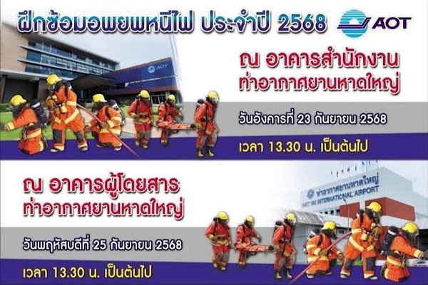 ในวันอังคาร ที่ 23 กันยายน 2568 เวลา 13.30 น. (ณ อาคารสำนักงานท่าอาศยานหาดใหญ่) และ วันพฤหัส ที่ 25 กันยายน 2568 เวลา 13.30 น. (ณ อาคารผู้โดยสารท่าอากาศยานหาดใหญ่)