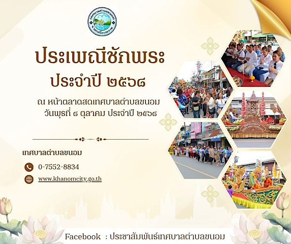 เทศบาลตำบลขนอม นำโดย นางพรรณสิริ บำรุง นายกเทศมนตรีตำบลขนอม พร้อมด้วยคณะผู้บริหาร สมาชิกสภาเทศบาล ปลัดเทศบาล หน้าส่วนราชการ พนักงานเทศบาล ร่วมโครงการส่งเสริมประเพณีชักพระ ประจำปี 2568 ณ หน้าตลาดสดเทศบาลเทศบาลตำบลขนอม (ตลาดบางโหนด) ซึ่งจัดขึ้นโดยเทศบาลตำบลขนอม อำเภอขนอม จังหวัดนครศรีธรรมราช