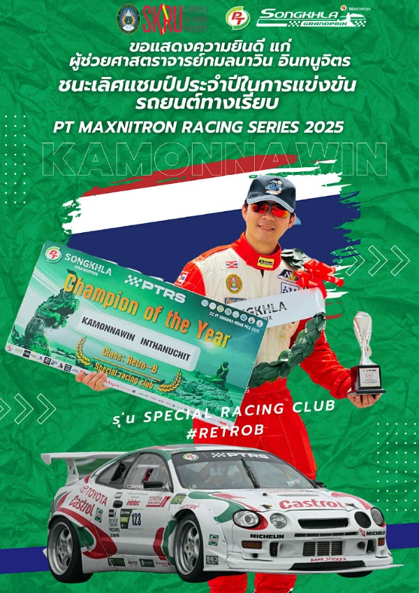“ผศ.กมลนาวิน อินทนูจิตร” รองผู้อำนวยสำนักศิลปะและวัฒนธรรม มรภ.สงขลา ตัวแทนนักแข่งชาวสงขลา คว้าแชมป์แข่งขันรถยนต์ทางเรียบ รายการ “PT Maxnitron Racing Series” รุ่น Special Racing Club ประจำปี 2025 เจ้าตัวสุดภูมิใจ จากนักศึกษาฟอร์มูล่าทีมลูกพระบิดา มหาวิทยาลัยสงขลานครินทร์ สู่อาจารย์มหาวิทยาลัยที่ขับรถแข่งได้นิดหน่อย
