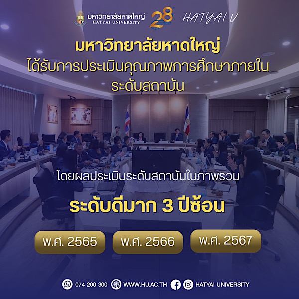 ผลการประเมินในระดับดีมากนี้ ไม่เพียงเป็นเครื่องยืนยันถึงคุณภาพของมหาวิทยาลัย แต่ยังเป็นแรงบันดาลใจในการพัฒนาต่อไป เพื่อให้มหาวิทยาลัยหาดใหญ่ก้าวสู่สากล.