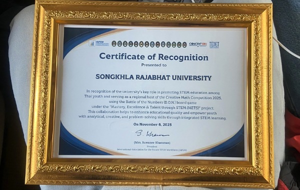โอกาสเดียวกันนี้ มรภ.สงขลา ยังได้รับประกาศนียบัตรเชิดชูเกียรติในฐานะสถาบันที่มีส่วนร่วมสำคัญในการขับเคลื่อนโครงการ “ผนึกกำลังสร้างเด็กไทยเก่งคณิตศาสตร์ด้วย STEM” สะท้อนให้เห็นถึงความมุ่งมั่นของคณะครุศาสตร์ในการพัฒนาศักยภาพนักศึกษาครูด้านคณิตศาสตร์และ STEM ให้ก้าวสู่ระดับสากลอย่างภาคภูมิ