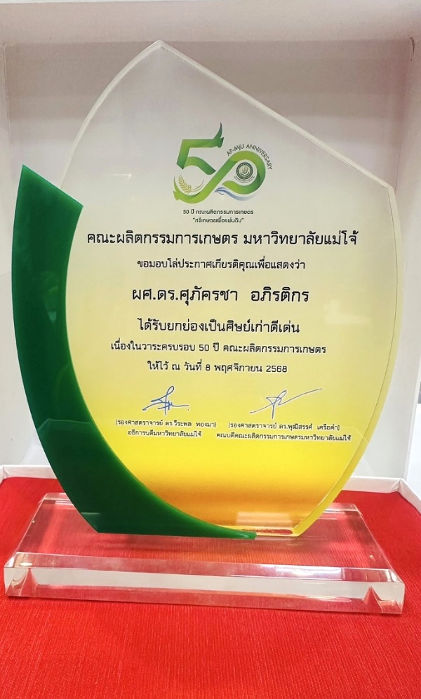 “ผศ.ดร.ศุภัครชา อภิรติกร” คณะเทคโนโลยีการเกษตร มรภ.สงขลา รับโล่เชิดชูเกียรติศิษย์เก่าดีเด่นคณะผลิตกรรมการเกษตร ม.แม่โจ้