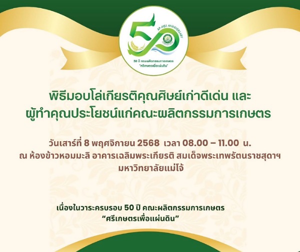 เมื่อวันที่ 8 พฤศจิกายน 2568 ผศ.ดร.ศุภัครชา อภิรติกร ประธานกรรมการบริหารหลักสูตรเทคโนโลยีบัณฑิต สาขาวิชาเทคโนโลยีการผลิตพืช คณะเทคโนโลยีการเกษตร มหาวิทยาลัยราชภัฎสงขลา (มรภ.สงขลา) เข้ารับโล่ยกย่องเชิดชูเกียรติศิษย์เก่าดีเด่นคณะผลิตกรรมการเกษตร ในงานครบรอบ 50 ปี คณะผลิตกรรมการเกษตร “ศรีเกษตรเพื่อแผ่นดิน” คณะผลิตกรรมการเกษตร มหาวิทยาลัยแม่โจ้ (ม.แม่โจ้) ณ ห้องข้าวหอมมะลิ อาคารเฉลิมพระเกียรติสมเด็จพระเทพรัตนราชสุดาฯ มหาวิทยาลัยแม่โจ้ จ.เชียงใหม่