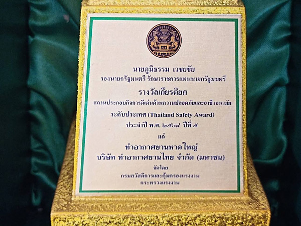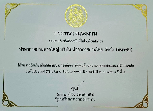 วันที่12พฤศจิกายน 2568(เวลา 09.30 น.) นายกฤษฎา พุกะทรัพย์ ผู้อำนวยการท่าอากาศยานหาดใหญ่ (ผหญ.) เข้าร่วมพิธีรับรางวัลเกียรติยศสถานประกอบกิจการดีเด่นด้านความปลอดภัยและอาชีวอนามัย ระดับประเทศ (Thailand Safety Award) ประจำปี 2568 ปีที่ 5 โดยกรมสวัสดิการและคุ้มครองแรงงาน จัดพิธีมอบรางวัลนี้ภายใต้การจัดกิจกรรม “เครือข่าย จป.ทั่วไทย รวมใจ สร้างความปลอดภัยสู่สังคมไทย” โดยได้รับเกียรติจาก นางสาวตรีนุช เทียนทอง รัฐมนตรีว่าการกระทรวงแรงงาน เป็นประธานในพิธีฯ และ เรือเอก สาโรจน์ คมคาย อธิบดีกรมสวัสดิการและคุ้มครองแรงงาน เป็นผู้มอบรางวัลฯ ณ ห้องประชุมใหญ่ ชั้น 4 กองความปลอดภัยแรงงาน อาคารกรมสวัสดิการและคุ้มครองแรงงาน (ส่วนแยกตลิ่งชัน) เพื่อยกย่องและเชิดชูเกียรติสถานประกอบกิจการที่มีการบริหารจัดการด้านความปลอดภัย อาชีวอนามัย และสภาพแวดล้อมในการทำงานเป็นอย่างดี.