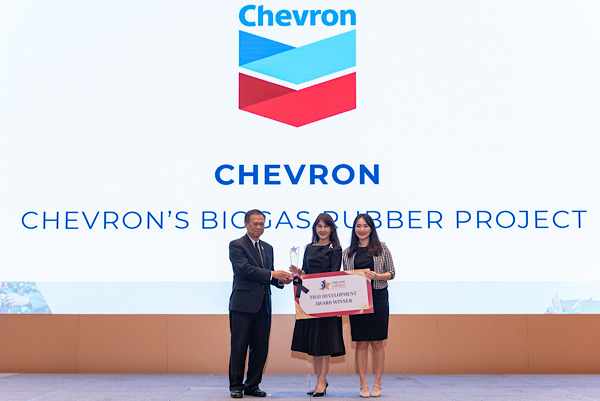 รางวัล “Thai Development Award” เป็นหนึ่งในสามรางวัลพิเศษที่มอบให้แก่องค์กรที่จัดทำโครงการที่สร้างผลกระทบเชิงบวกต่อสังคม ซึ่งเชฟรอนได้รับรางวัลนี้ จากโครงการ “ก๊าซชีวภาพสหกรณ์ยางพาราสู่สังคมคาร์บอนต่ำ” ที่เป็นความร่วมมือกับสถาบันวิจัยระบบพลังงาน (PERIN) มหาวิทยาลัยสงขลานครินทร์ ในการมอบความรู้ให้กับชุมชน นำระบบก๊าซชีวภาพ ระบบพลังงานแสงอาทิตย์ และโมเดล Zero Waste มาใช้ในกระบวนการรมควันยางแผ่น เพื่อเปลี่ยนน้ำเสียเป็นก๊าซชีวภาพและนำมารมควันจนได้ ‘ยางแผ่นรมควันคาร์บอนต่ำ’ เป็นผลสำเร็จ และสามารถแก้ปัญหาสิ่งแวดล้อม เช่น กลิ่นเหม็นและน้ำเสียจากการผลิตยางรมควันแบบดั้งเดิมของกลุ่มเกษตรกรชาวสวนยาง