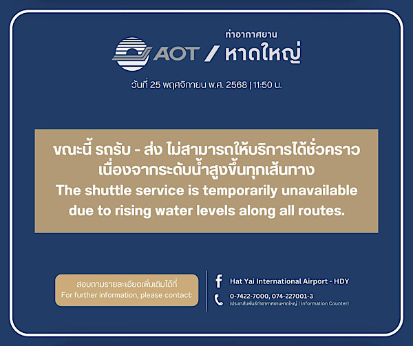 ท่าอากาศยานหาดใหญ่ ขอแจ้งให้ทราบว่า ขณะนี้ รถรับ – ส่ง มายังสนามบิน จากหน่วยสนับสนุนต่างๆ ไม่สามารถให้บริการได้ชั่วคราว เนื่องจากระดับน้ำโดยรอบสูงขึ้นทุกเส้นทาง