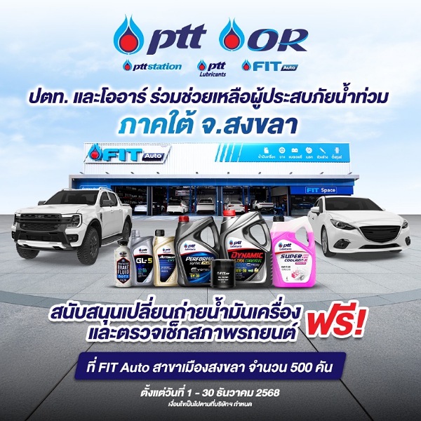 โออาร์ ยังเตรียมเปิดให้บริการเปลี่ยนถ่ายน้ำมันเครื่องรถจักรยานยนต์ที่ถูกน้ำท่วม จำนวน 2,500 คัน ระหว่างวันที่ 1–30 ธันวาคม 2568 ณ สถานีบริการ พีทีที สเตชั่น จำนวนเบื้องต้น 4 แห่ง ได้แก่ 1. บจ.กิจถาวร 2018 2. บจ.เอส.บี. ออโต้เซลส์ 3. บจ.ทรัพย์ออยล์ปิโตรเลียม 4. สาขาสนามบินหาดใหญ่ ส่วนบริการสำหรับรถยนต์ จะเปิดให้บริการเปลี่ยนถ่ายน้ำมันเครื่อง จำนวน 500 คัน ณ ศูนย์บริการยานยนต์ FIT Auto สาขาเมืองสงขลา โดยมีทีมช่างผู้เชี่ยวชาญให้บริการตรวจเช็ก ซ่อมบำรุง เปลี่ยนถ่ายน้ำมันเครื่องและของเหลวอื่นๆ และให้คำแนะนำเกี่ยวกับการใช้งานรถหลังผ่านเหตุอุทกภัย เพื่อช่วยให้ประชาชนกลับมาใช้ยานพาหนะได้อย่างปลอดภัยและมั่นใจ นอกจากนี้ โออาร์ ยังจัดตั้งศูนย์ช่วยเหลือ 5 จุด เพื่อเป็นจุดพักพิงและส่งต่อความช่วยเหลือ รวมทั้งเป็นจุดบริการในการตรวจสอบและซ่อมแซมถังและเตาก๊าซแอลพีจี (LPG) ในครัวเรือนที่ได้รับความเสียหาย พร้อมเร่งฟื้นฟู สถานีบริการ พีทีที สเตชั่น ที่ได้รับผลกระทบจากอุทกภัยเพื่อให้กลับมาเปิดให้บริการโดยเร็วที่สุด ทั้งนี้ ปตท. และ โออาร์ ยังได้มอบกาแฟพร้อมดื่ม คาเฟ่ อเมซอน จำนวน 3,240 ขวด แก่โรงพยาบาลหาดใหญ่ เพื่อเป็นกำลังใจและสนับสนุนการปฏิบัติหน้าที่ของบุคลากรทางการแพทย์โดยก่อนหน้านี้ โออาร์ ยังได้ลงพื้นที่มอบถุงยังชีพและน้ำแร่คาเฟ่ อเมซอน กว่า 20,000 ขวด ผ่านหน่วยบัญชาการทหารพัฒนา กองบัญชาการกองทัพไทย เพื่อบรรเทาความเดือดร้อนเบื้องต้นของประชาชน พร้อมสนับสนุนก๊าซหุงต้ม ปตท. สำหรับศูนย์อพยพมหาวิทยาลัยสงขลานครินทร์ และโรงครัวพระราชทานในพื้นที่ภาคใต้ รวมถึงมอบบัตรน้ำมันมูลค่า 200,000 บาท แก่กองทัพอากาศเพื่อสนับสนุนภารกิจปฏิบัติการลำเลียงสิ่งของให้ผู้ประสบอุทกภัย