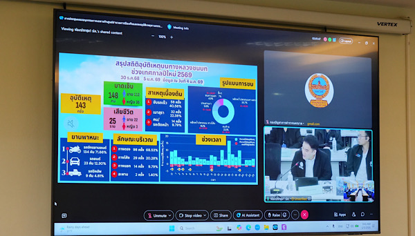 การประชุมศูนย์อำนวยการความปลอดภัยทางถนนจังหวัดสงขลา เพื่อติดตามสถานการณ์ วิเคราะห์ปัจจัยเสี่ยงอุบัติเหตุในพื้นที่ พร้อมวางมาตรการและปรับแนวทางการดำเนินงานให้สอดคล้องกับสภาพปัญหาในช่วงควบคุมเข้มข้น ระหว่างวันที่ 30 ธันวาคม 2568 ถึง 5 มกราคม 2569 ภายใต้ชื่อการรณรงค์ “ขับขี่ปลอดภัย ลดความเร็ว ลดอุบัติเหตุ“ โดยข้อมูลอุบัติเหตุประจำวันที่ 4 มกราคม 2569 ซึ่งเป็นวันที่ 6 ของการรณรงค์ เกิดอุบัติเหตุ จำนวน 4 ครั้ง มีผู้บาดเจ็บ จำนวน 5 คน (เพศชาย 4 คน เพศหญิง 1 คน) (อ.ควนเนียง 2 คน , อ.บางกล่ำ 1 คน , อ.จะนะ 1 คน และ อ.เทพา 1 คน) โดยมีผู้เสียชีวิต จำนวน 1 ราย (อำเภอเทพา เพศชาย 1 ราย)