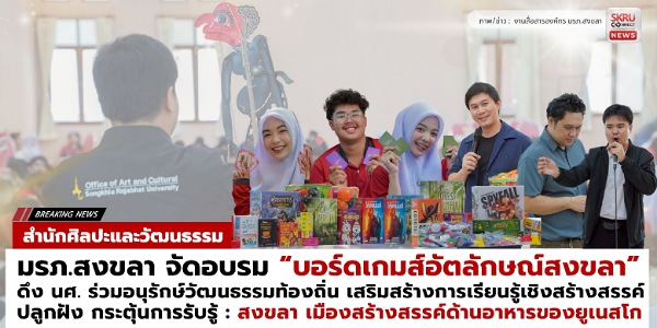สำนักศิลปะและวัฒนธรรม มรภ.สงขลา จัดอบรมบอร์ดเกมส์อัตลักษณ์สงขลา ดึงนักศึกษา 7 คณะพัฒนาทักษะการเรียนรู้ผ่านกิจกรรมบอร์ดเกมส์ ปลุกพลังเยาวชนร่วมขับเคลื่อน จ.สงขลา สู่การเป็นเมืองสร้างสรรค์ด้านอาหารของยูเนสโก พร้อมสร้างจิตสำนึกอนุรักษ์วัฒนธรรมท้องถิ่น