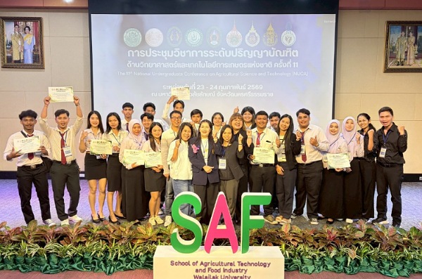 ตัวแทนนักศึกษาคณะเทคโนโลยีการเกษตร มหาวิทยาลัยราชภัฏสงขลา (มรภ.สงขลา) เข้าร่วมนำเสนอผลงานในงานประชุมวิชาการระดับปริญญาบัณฑิต ด้านวิทยาศาสตร์และเทคโนโลยีการเกษตรแห่งชาติ ครั้งที่ 11 (NUCA 2026) เมื่อวันที่ 23-24 กุมภาพันธ์ 2569 ณ สำนักวิชาเทคโนโลยีการเกษตรและอุตสาหกรรมอาหาร มหาวิทยาลัยวลัยลักษณ์ จ.นครศรีธรรมราช ภายใต้แนวคิด “Next Gen for Agri’s Future : พลังคนรุ่นใหม่ ขับเคลื่อนอนาคตเกษตรไทย” ผลปรากฏว่านักศึกษาที่ไปแข่งขันทุกคนได้รับรางวัลกลับมา โดยสามารถคว้ามาได้ 11 รางวัล แบ่งออกเป็น ระดับโดดเด่น 2 รางวัล ระดับดีมาก 4 รางวัล ระดับดี 2 รางวัล และ ระดับพอใช้ 3 รางวัล พร้อมคว้ารางวัลคะแนนรวมสูงสุดจากผลงานนวัตกรรมหรือสิ่งประดิษฐ์และพูดส่งเสริมการเกษตร รายละเอียดดังนี้
