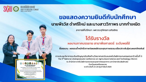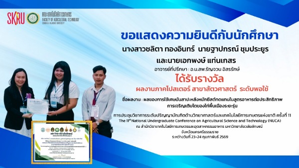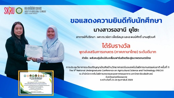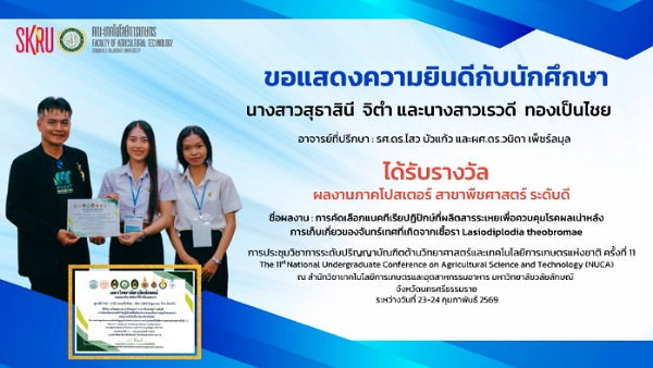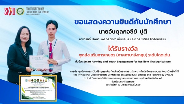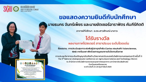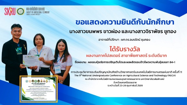 ตัวแทนนักศึกษาคณะเทคโนโลยีการเกษตร มหาวิทยาลัยราชภัฏสงขลา (มรภ.สงขลา) เข้าร่วมนำเสนอผลงานในงานประชุมวิชาการระดับปริญญาบัณฑิต ด้านวิทยาศาสตร์และเทคโนโลยีการเกษตรแห่งชาติ ครั้งที่ 11 (NUCA 2026) เมื่อวันที่ 23-24 กุมภาพันธ์ 2569 ณ สำนักวิชาเทคโนโลยีการเกษตรและอุตสาหกรรมอาหาร มหาวิทยาลัยวลัยลักษณ์ จ.นครศรีธรรมราช ภายใต้แนวคิด “Next Gen for Agri’s Future : พลังคนรุ่นใหม่ ขับเคลื่อนอนาคตเกษตรไทย” ผลปรากฏว่านักศึกษาที่ไปแข่งขันทุกคนได้รับรางวัลกลับมา โดยสามารถคว้ามาได้ 11 รางวัล แบ่งออกเป็น ระดับโดดเด่น 2 รางวัล ระดับดีมาก 4 รางวัล ระดับดี 2 รางวัล และ ระดับพอใช้ 3 รางวัล พร้อมคว้ารางวัลคะแนนรวมสูงสุดจากผลงานนวัตกรรมหรือสิ่งประดิษฐ์และพูดส่งเสริมการเกษตร รายละเอียดดังนี้ รางวัลระดับโดดเด่น ภาคโปสเตอร์ สาขาประมง จากผลงานเรื่อง การประเมินสุขภาวะพ่อพันธุ์ปลาดุกลำพัน Clarias nieuhofii Valenciennes, 1840 จากโรงเพาะฟักด้วยการบูรณาการตัววัดทางชีวภาพ ผลงานโดย นายธนกร จันทร์เพ็ชร และ นายยัตเซอร์อาราฟัตร คัมภีร์กิตติ สาขาวิชาเทคโนโลยีการผลิตสัตว์น้ำ อาจารย์ผู้ดูแล อาจารย์ ดร.เสาวลักษณ์ มาลาวะ รางวัลระดับโดดเด่น การพูดส่งเสริมการเกษตร (ภาคภาษาอังกฤษ) จากเรื่อง Smart Farming and Youth Engagement for Resilient Thai Agriculture ผลงานโดย นายอับดุลกอซีย์ ปูติ สาขาวิชาเกษตรศาสตร์ อาจารย์ผู้ดูแล ผศ.ดร.วนิดา เพ็ชร์ลมุล และ อาจารย์ ดร.ชาติรส จิตรักษ์ธรรม